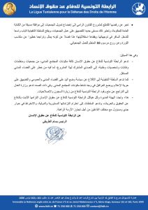 – هذا، وتجدد الهيئة المديرة وكل هياكل الرابطة التونسية للدفاع عن حقوق الإنسان التزامها الثابت بالدفاع عن الحقوق والحريات، وتدعو السلطات إلى احترام التزاماتها الدستورية والدولية، والانخراط في حوار جدي ومسؤول مع مختلف الفاعلين من أجل تجاوز الأزمة الراهنة.