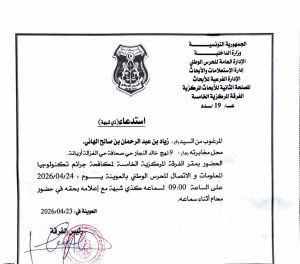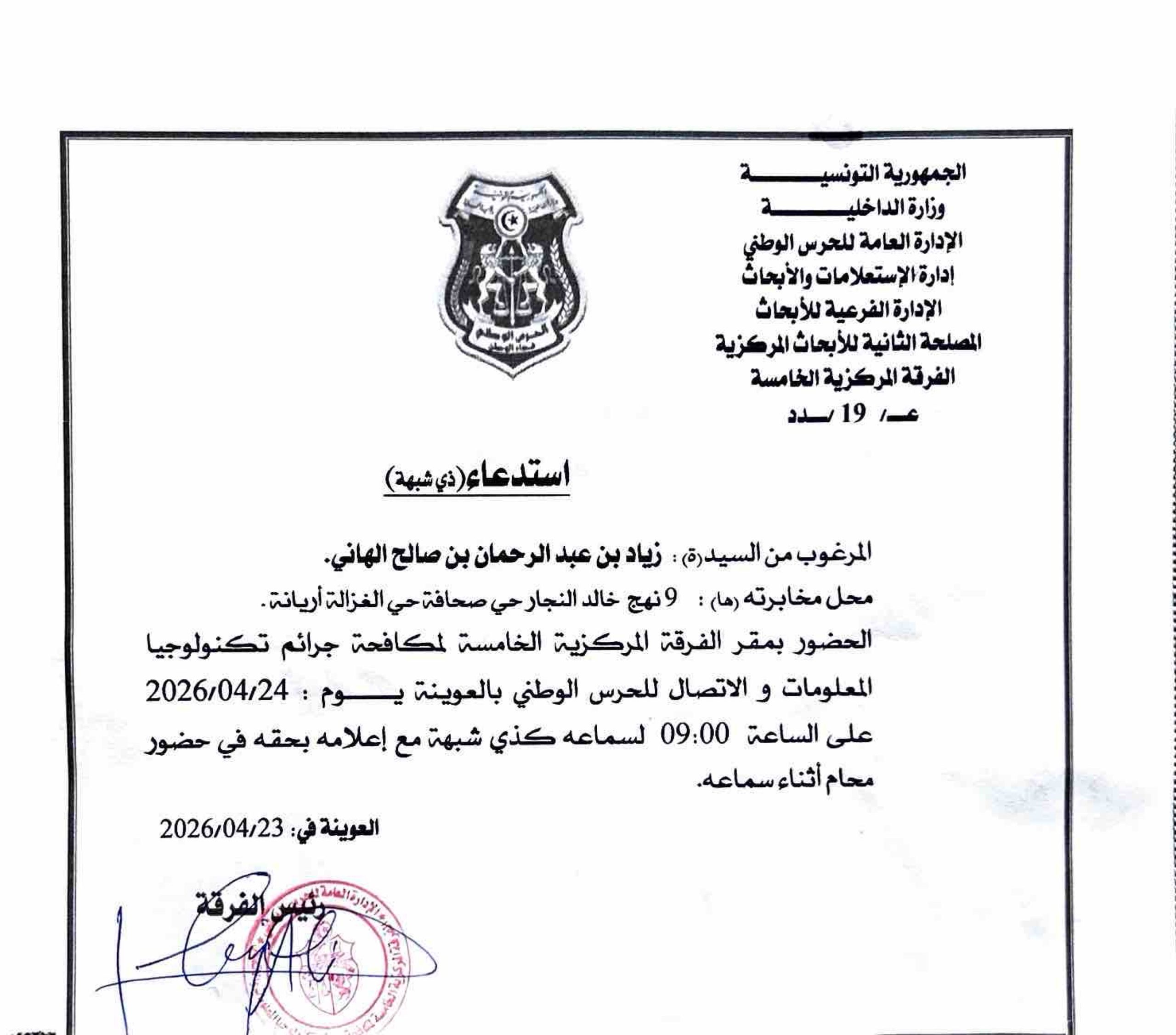 استدعاء لدى الفرقة المركزية الخامسة لمكافحة جرائم تكنولوجيا المعلومات والاتصال للحرس الوطني بالعوينة، بصفة ذي شبهة.